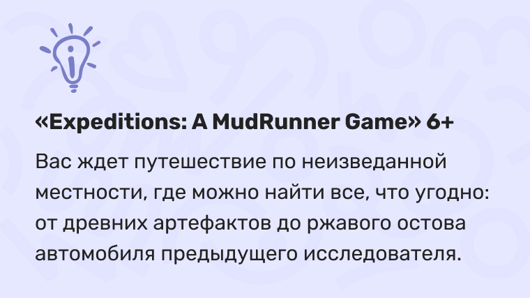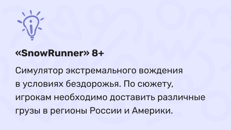 Еще один отличный вариант — «SnowRunner», где игрок учится управлять внедорожниками, грузовиками в условиях бездорожья, переключать коробку передач, двигаться задним ходом, доставлять грузы. Полезный и развивающий контент.