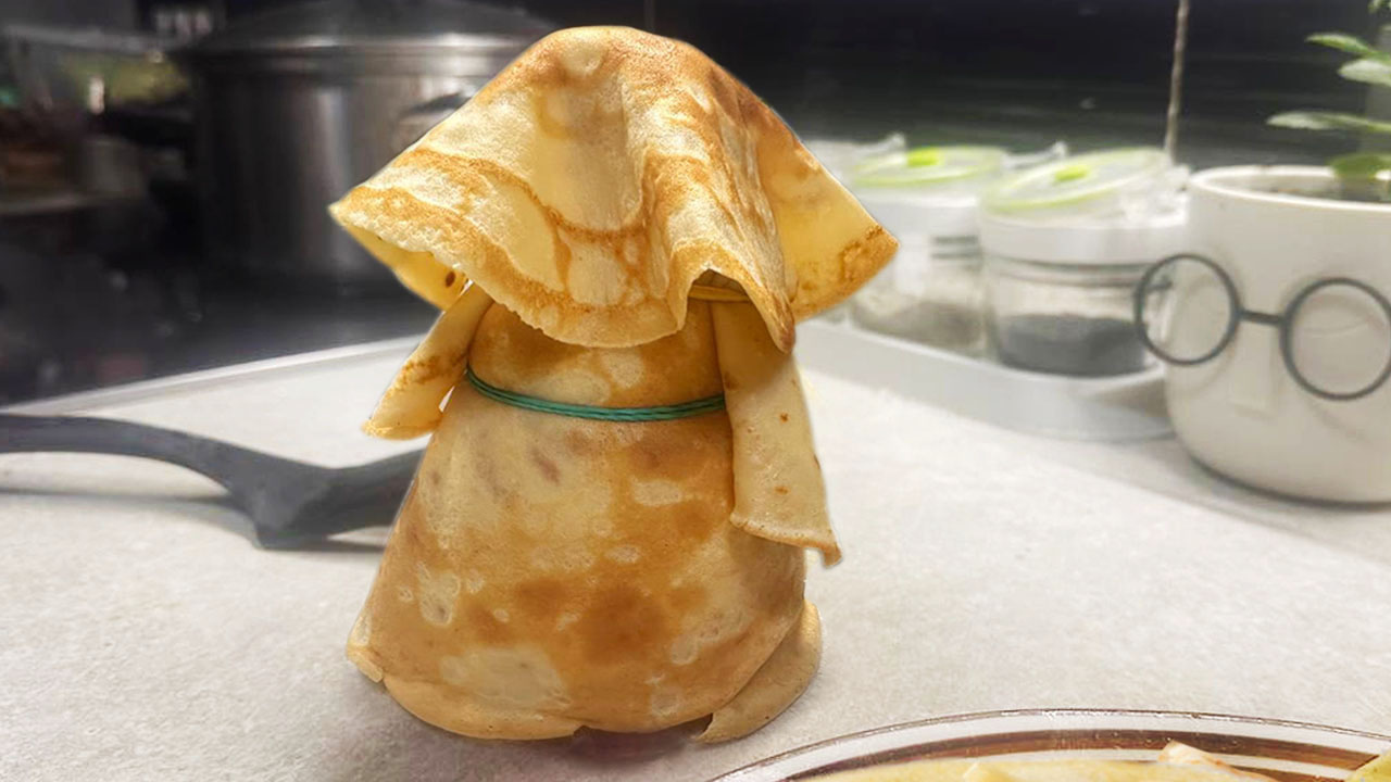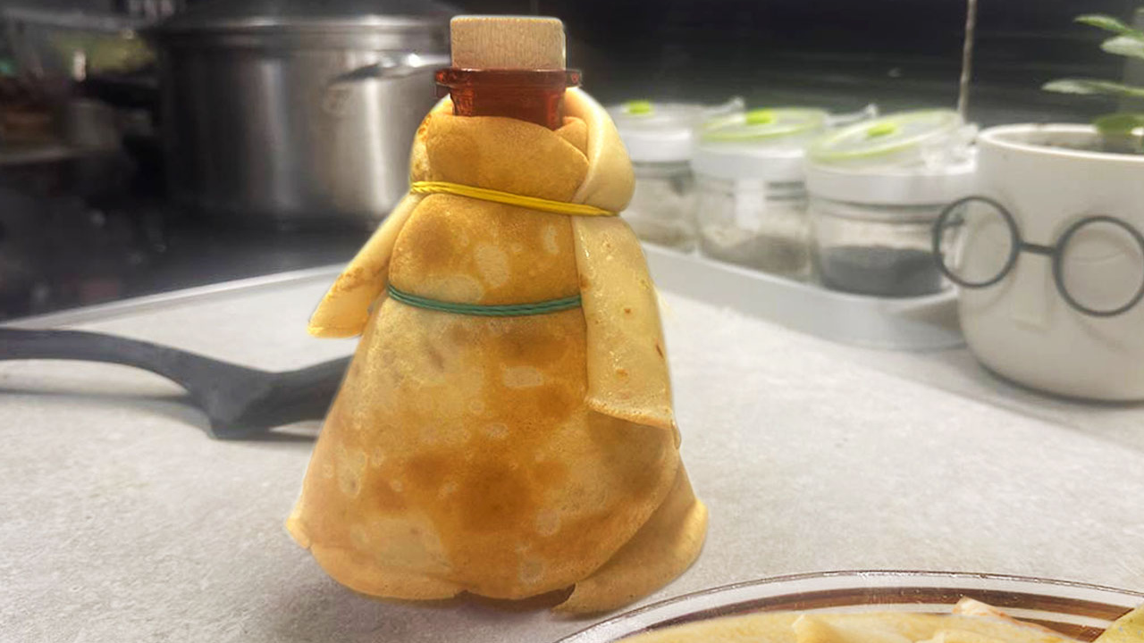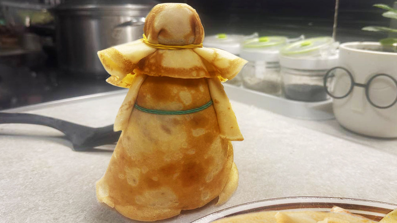 🥞 Куклу лучше всего собирать из теплых блинов, но не горячих. Они более податливые и меньше рвутся. Если блины купленные, подогрейте их