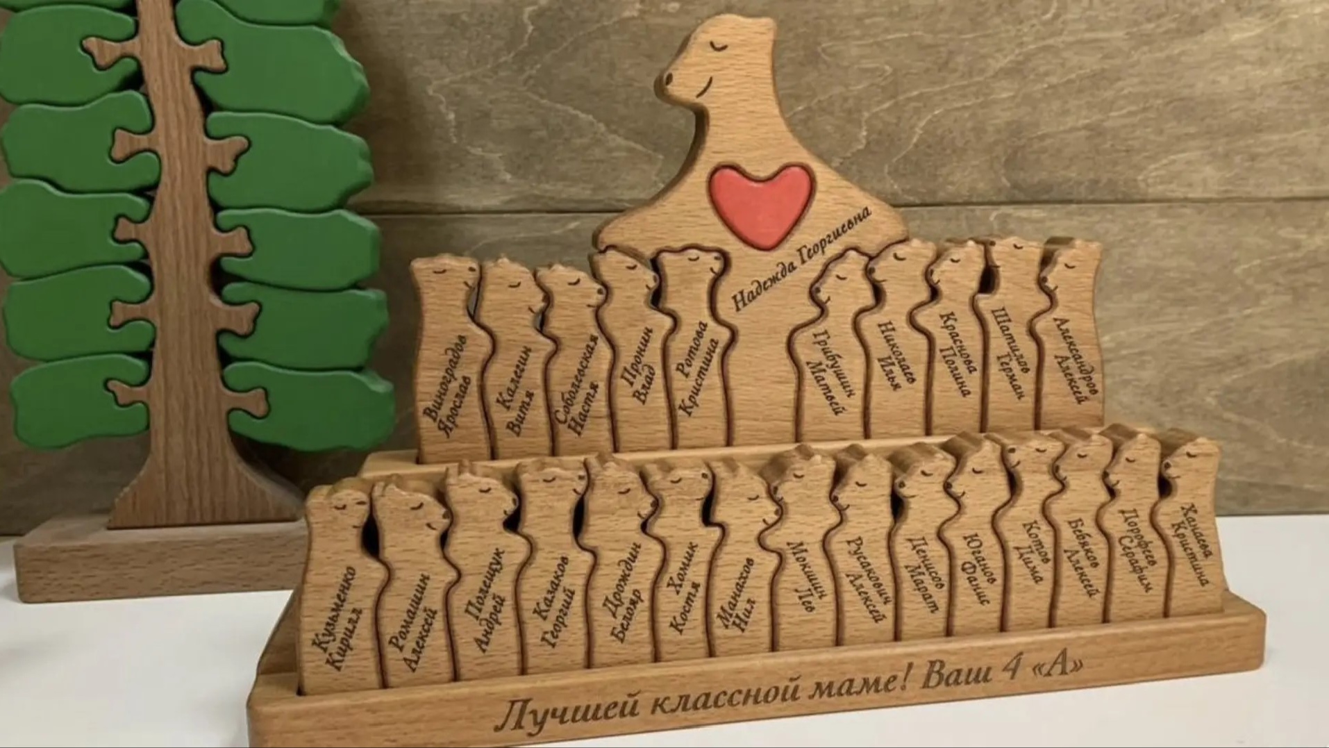 Еще одна идея — статуэтка из дерева. Точнее, сувенир-пазл, который изображает, например, мишку с медвежатами или льва (львицу) с львятами. И у каждого детеныша — именная гравировка. Теперь педагог точно никогда не забудет, как звали самого шумного двоечника или отличницу, которая вечно забывала физкультурную форму!