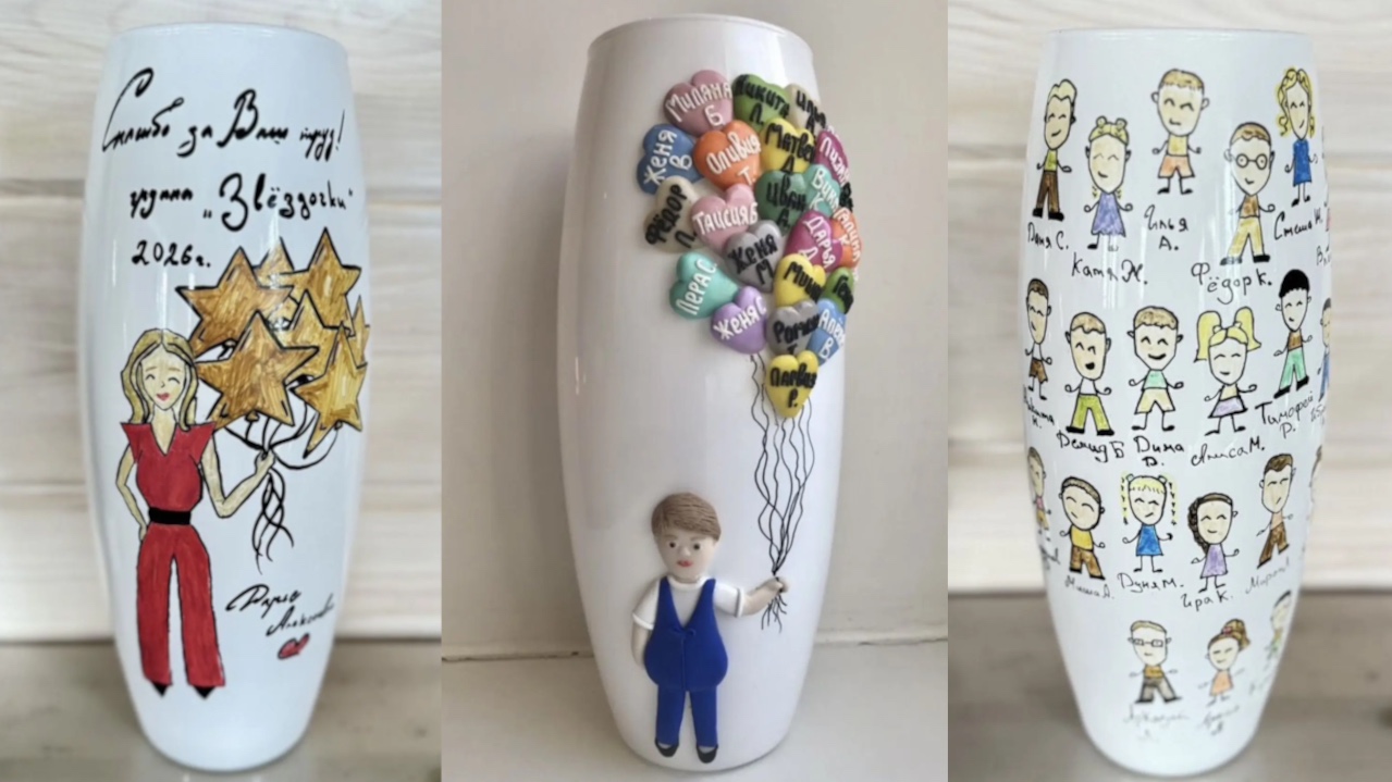 Лайфхак: а можно заказать авторскую вазу с декором. Например, попросить мастера украсить сосуд воздушными шариками из полимерной глины, на которых написаны имена детей или пожелания от учеников.