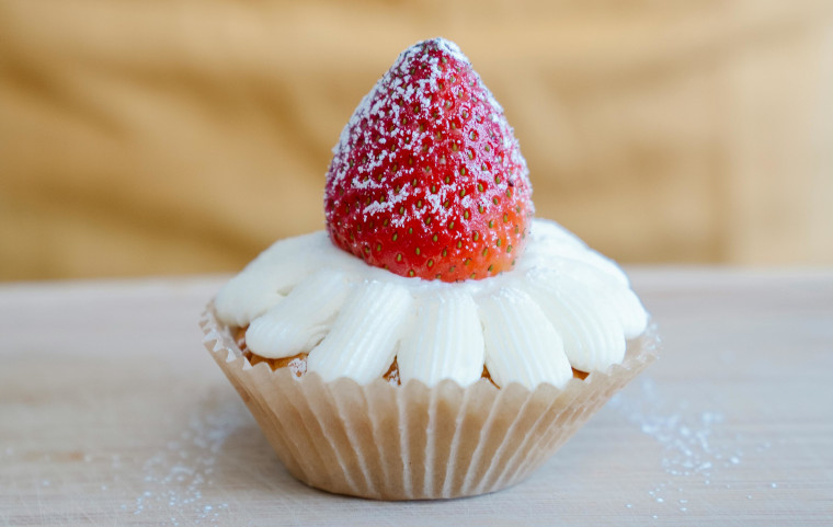 - При помощи кулинарного мешка или шприца делаем волнистую пирамидку на капкейке. Сверху аккуратно «сажаем» клубнику.