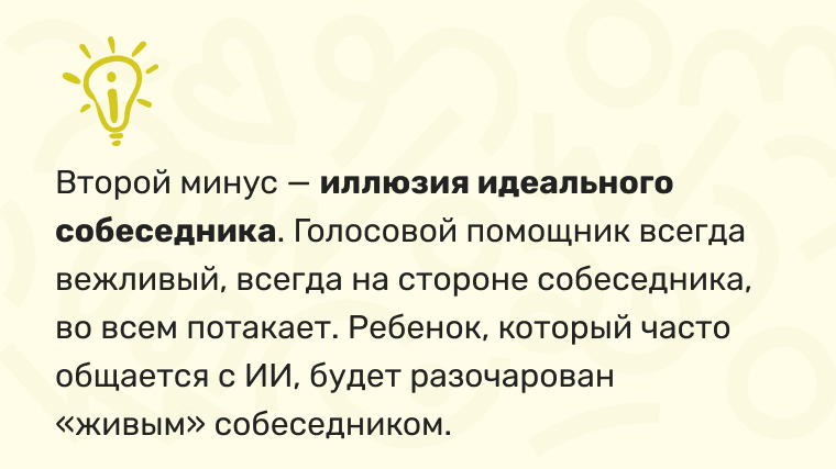 Изначальное правильное знакомство с ИИ помогает ребенку не воспринимать устройство как настоящего собеседника.