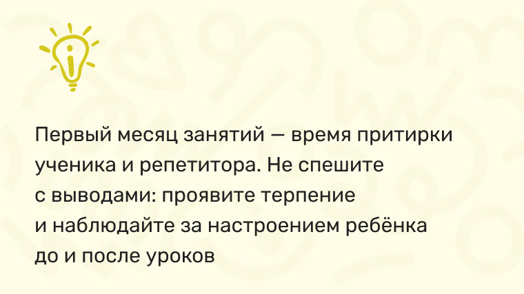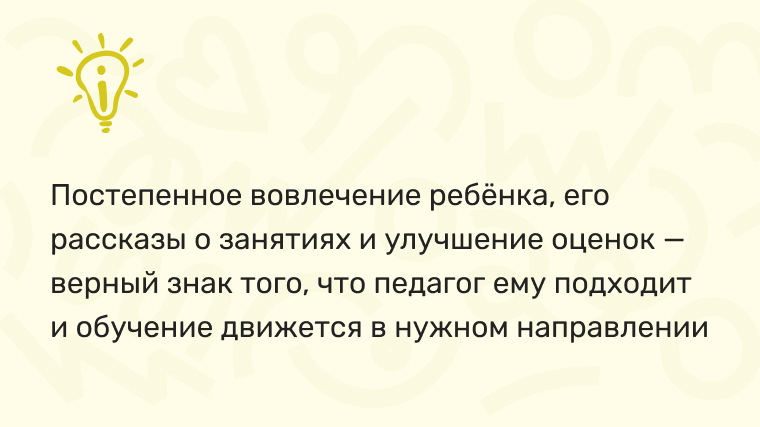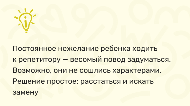И обязательно учитывайте мнение ребенка. Если репетитор ему совсем не нравится, вряд ли стоит продолжать. Даже если у педагога предостаточно регалий и дипломов и все вокруг от него в восторге, от занятий в напряженной атмосфере высоких результатов ожидать сложно. Помните: «Посредственный учитель рассказывает, хороший учитель объясняет, превосходный учитель демонстрирует, великий учитель вдохновляет» (Уильям Артур Уорд).